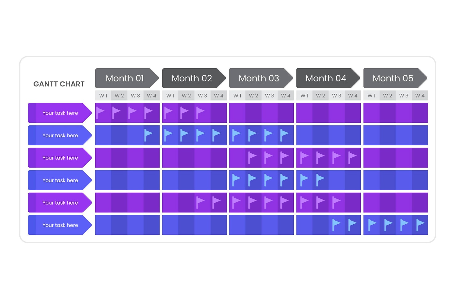 Biểu đồ Gantt thể hiện một dự án và các nhiệm vụ của nó trên trục thời gian. Phía bên trái liệt kê các nhiệm vụ và hoạt động. Phía bên phải hiển thị các thanh ngang biểu thị tiến độ của mỗi nhiệm vụ. Các thanh này giúp người dùng thấy được các nhiệm vụ đang tiến hành, nhiệm vụ đã hoàn thành, nhiệm vụ tiếp theo và người chịu trách nhiệm.